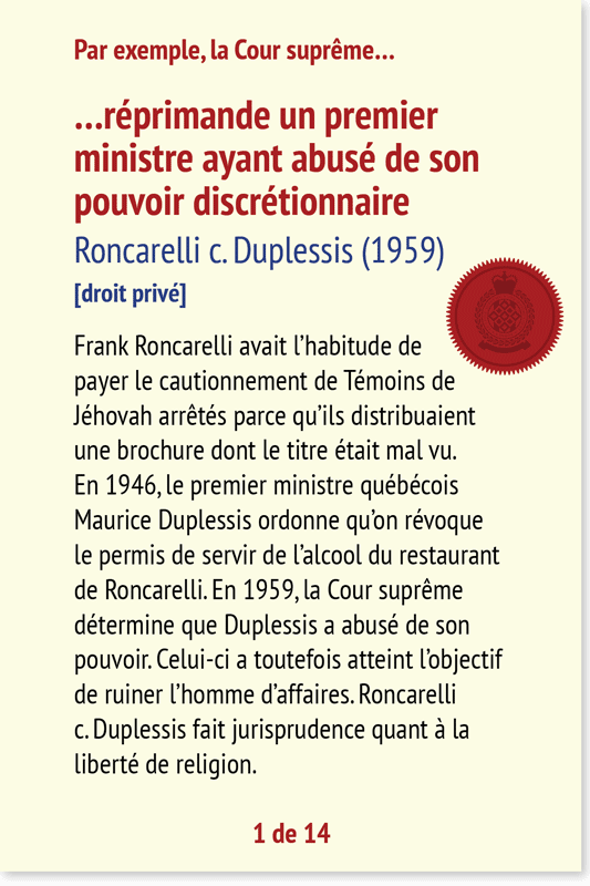 Frank Roncarelli avait l’habitude de payer le cautionnement de Témoins de Jéhovah arrêtés parce qu’ils distribuaient une brochure dont le titre était mal vu. En 1946, le premier ministre québécois Maurice Duplessis ordonne qu’on révoque le permis de servir de l’alcool du restaurant de Roncarelli. En 1959, la Cour suprême détermine que Duplessis a abusé de son pouvoir. Celui-ci a toutefois atteint l’objectif de ruiner l’homme d’affaires. Roncarelli c. Duplessis fait jurisprudence quant à la liberté de religion.