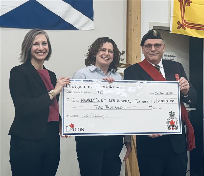 La Fondation de l’Hôpital général de Hawkesbury (HGH) a reçu un appui financier des plus appréciés lors du récent souper Robert Burns, grâce à la générosité de la Légion royale canadienne de Hudson. À cette occasion, un don de 2 000 $, provenant du Legion Poppy Fund, a été remis à la Fondation afin de soutenir l’amélioration continue des soins de santé offerts dans la région.